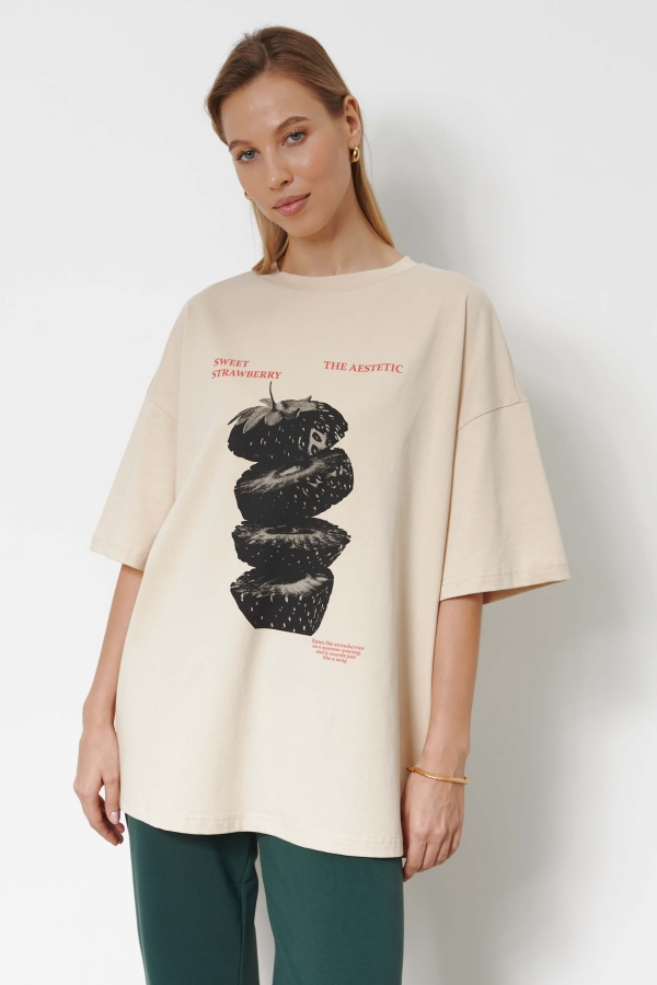 Стильная футболка из трикотажного полотна с авторским принтом. Оверсайз модель. Рукав спущенный. Горловина обработана бейкой.