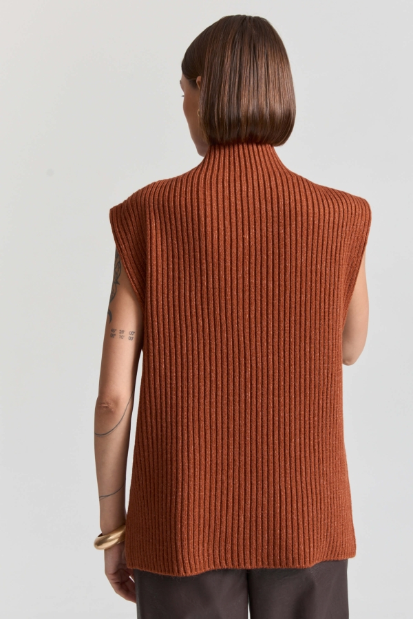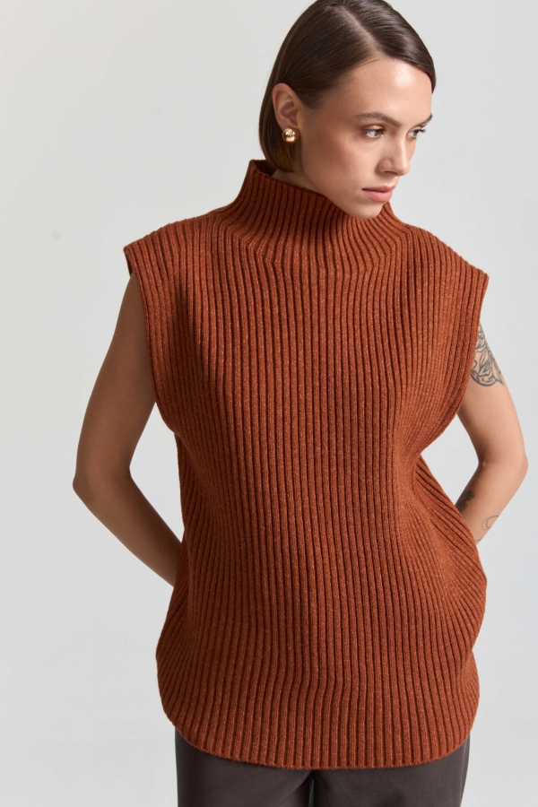 Вязаный жилет из смесовой пряжи актуального цвета. Модель свободная прямая со спущенным плечом и цельным воротником.
